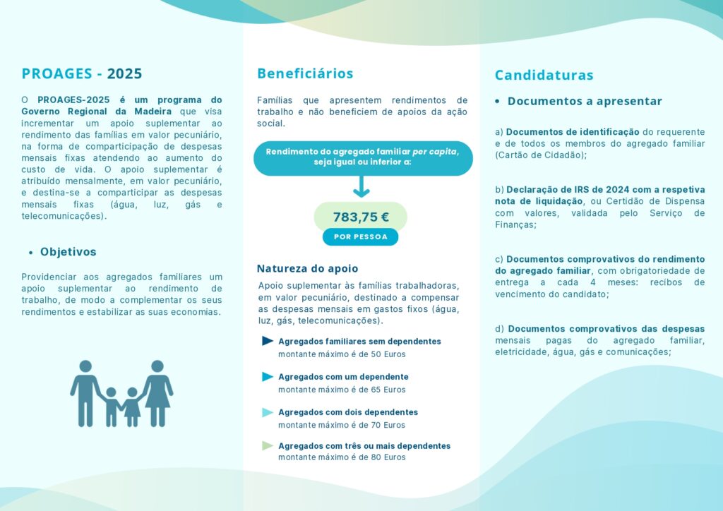 O PROAGES é um programa do Governo Regional da Madeira, que visa incrementar um apoio suplementar ao rendimento familiar, através da comparticipação de despesas mensais fixas (água, luz, gás e telecomunicações).