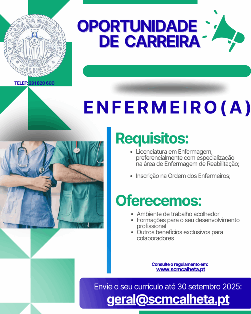 José Mário de Sousa Nunes, Provedor da Santa Casa da Misericórdia da Calheta, torna público que, a Mesa Administrativa, em reunião de 18 de setembro de 2025, deliberou abrir concurso para recrutamento de 1 Enfermeiro/a (M/F), com vista à celebração de um contrato de trabalho a termo certo pelo período de 1 (um) ano, com possibilidade de renovação.
